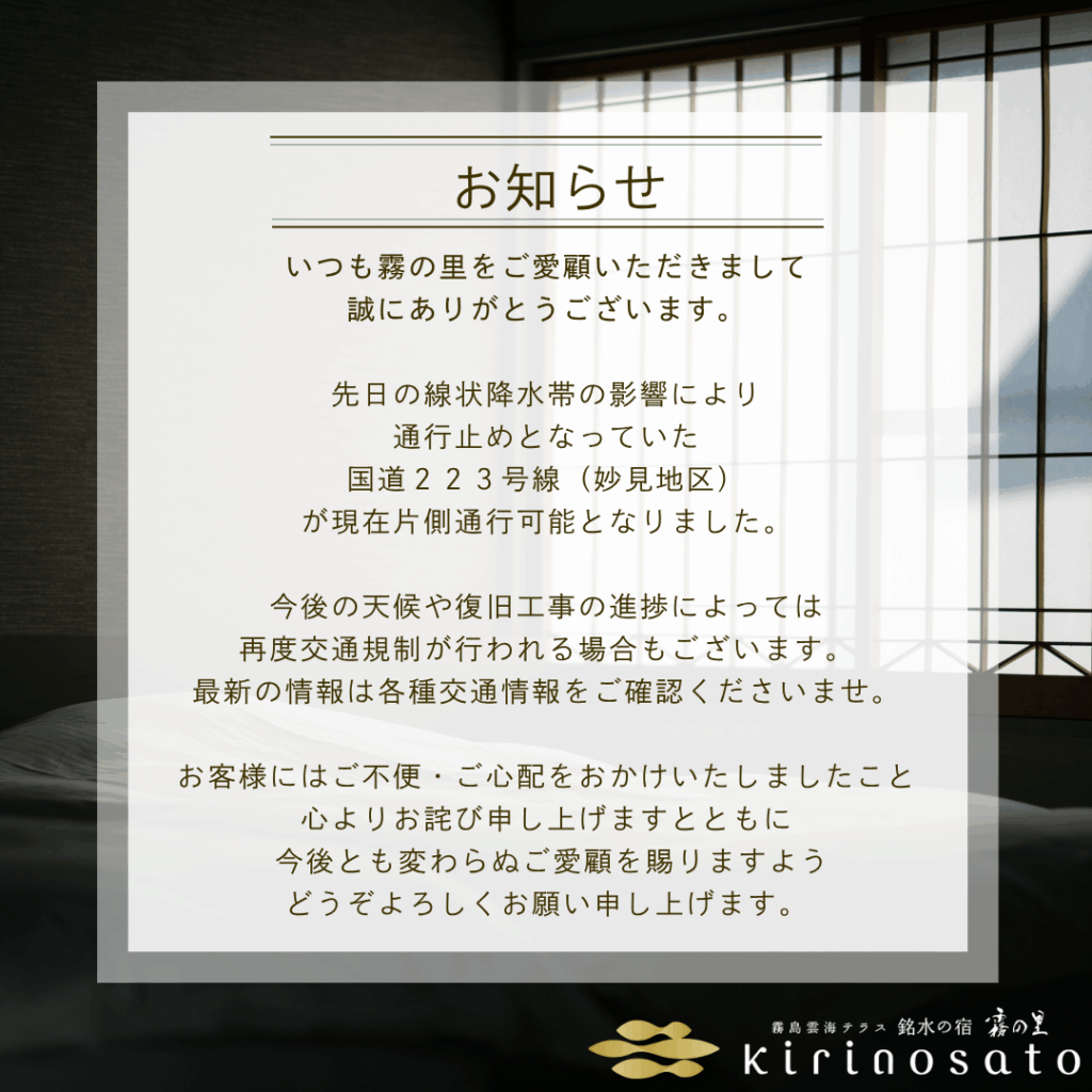 また、今後の天候や復旧作業の進行状況により、再び交通規制が実施される可能性もございます。