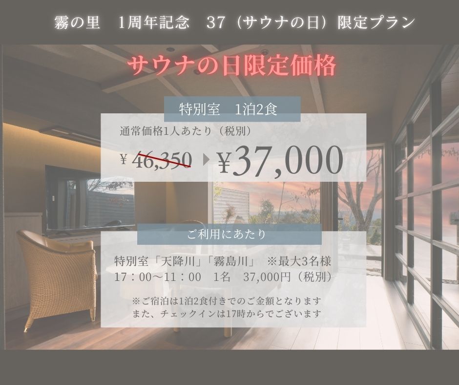 2室限定(サウナ付特別室「天降川」「霧島川」)の特別プランとなります。
